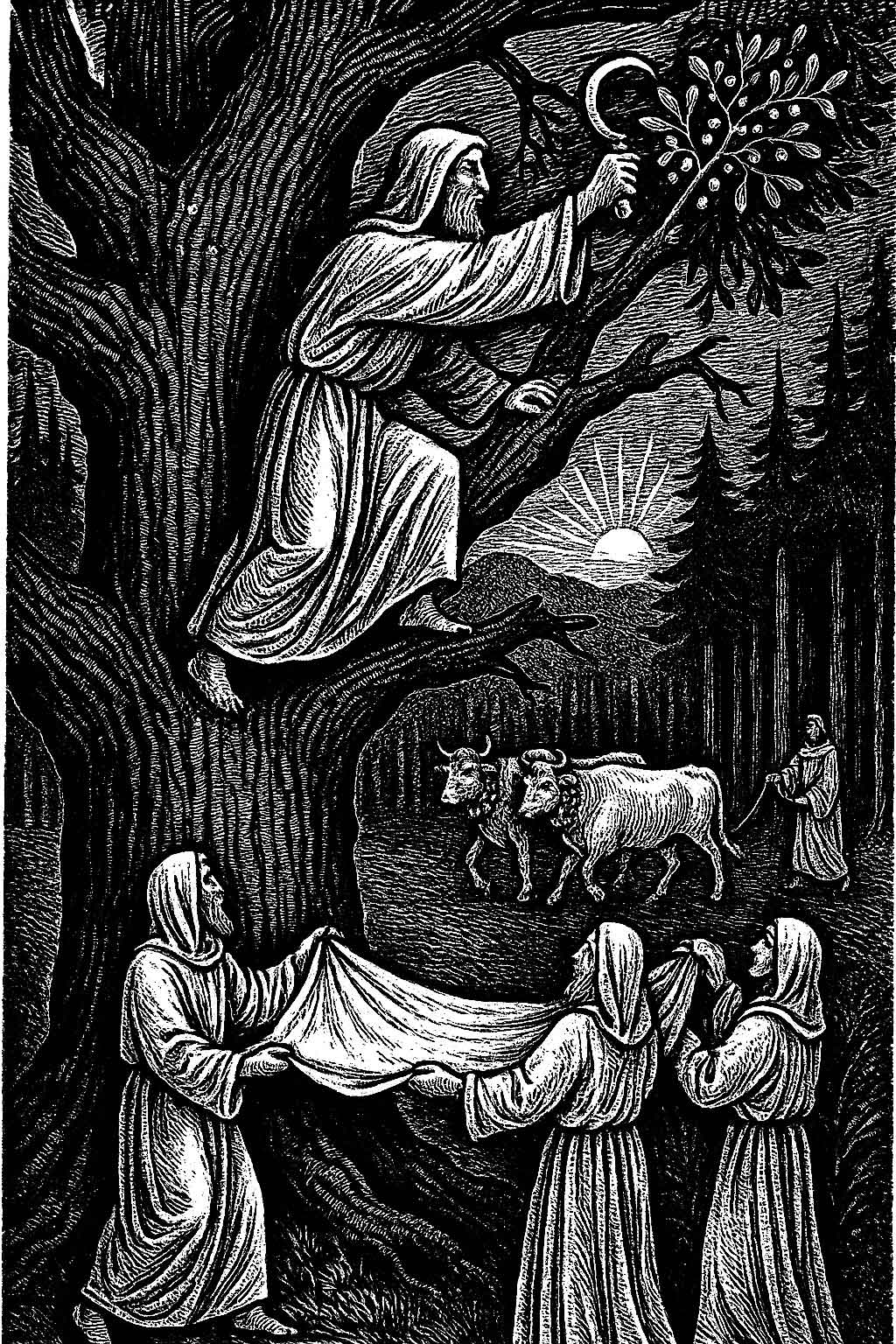 On the sixth day of the moon, so Pliny says, a great procession went out into the oak groves. The chief priest, clad in white, climbed the sacred tree carrying a golden sickle. Below, other Druids held out a spotless white cloth so that not a fragment of the plant would touch the earth. Two white bulls, never before yoked, were led to the tree as sacrifices. At the cutting of the mistletoe the bulls were slain, prayers were offered and the gathered plant was distributed among the people.