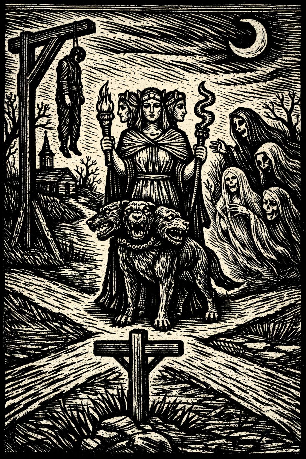 The folklore of crossroads is one of the longest-running threads in Western culture, stretching from the stone altars of ancient Greece to the staked skeletons unearthed by Victorian gas-pipe diggers; from the triple-headed goddess Hecate to the phantom monk glimpsed in car headlights on a Leicestershire road in 1949. It winds through Roman milestone inscriptions, medieval witch trials, Cornish devil legends, Somerset suicide graves, and a Sussex wood where someone, in living memory, was apparently sacrificing dogs to a deity worshipped at the crossroads two thousand years before Christ.