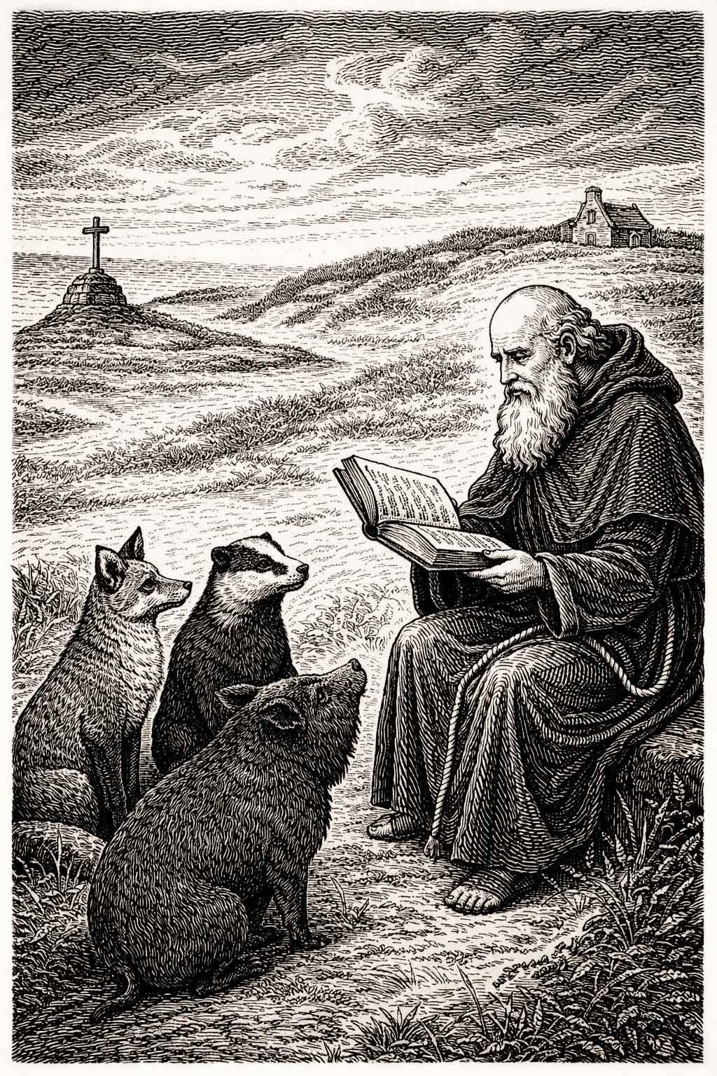 The first community Piran attracted was not human but animal. A boar, a fox, a badger, a wolf, and a hind with a fawn came to him humbly and served him obediently. These animals were his original monastics, his first community before any human disciple arrived. A subsequent episode introduces comedy: the fox stole Piran's shoes, desiring to eat them, and carried them to his former den. Piran sent the badger to hunt for the fox. Finding him, the badger cut off his ears and tail with his teeth and violently pulled off his hair. The chastened fox followed the badger back to the saint, carrying the shoes safe. Piran rebuked him: 'Why did you cause so much wrong by not enduring a shortage of food and drink?' The fox repented and fasted for three days. In the Irish original, the badger discovers the fox has already eaten the ears and thongs from the shoes - a detail the Cornish version quietly glosses over.