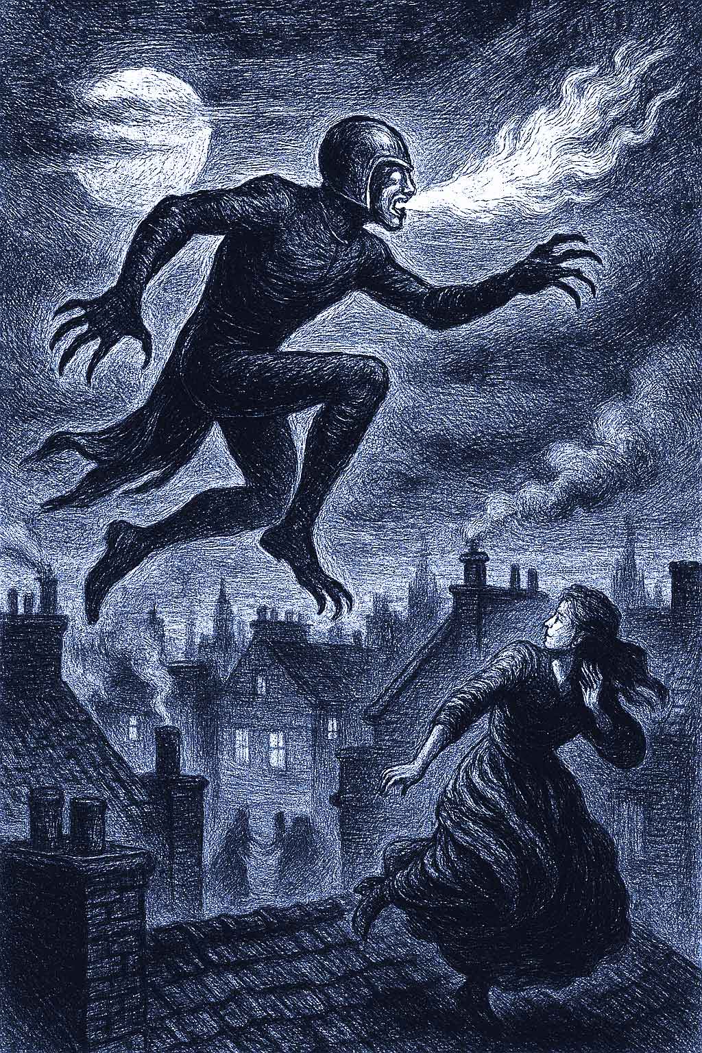 The Staffordshire Advertiser (24 February 1838) reprinted one of the earliest and most graphic accounts from London. It described Miss Alsop, aged 18, answering her door to a cloaked visitor who “vomited forth a quantity of blue and white flame” and whose “eyes resembled red balls of fire.” He wore a helmet and a tight-fitting suit “of white oilskin,” and attacked her with “claws of some metallic substance,” leaving her neck and arms lacerated. The account ends with the figure vanishing into the night, establishing the archetypal description that would haunt Britain for generations.