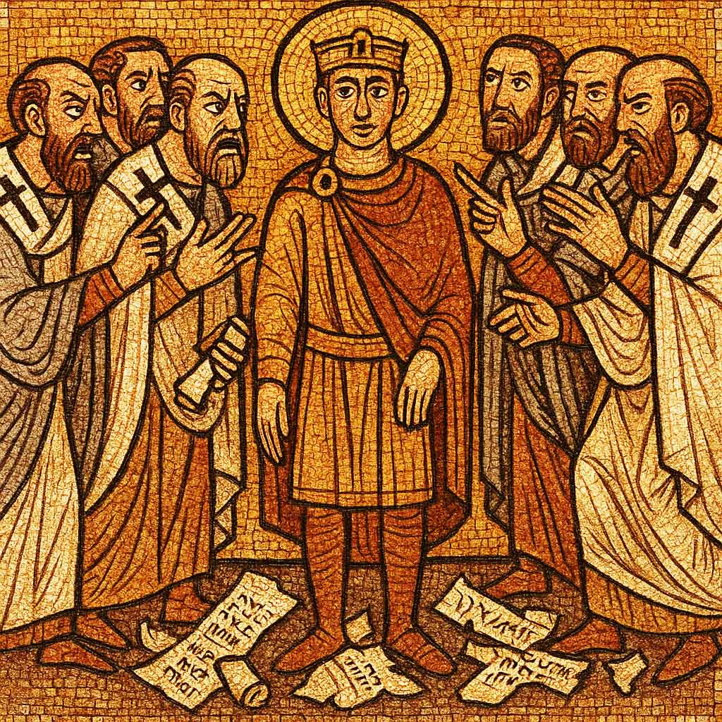 Constantine between rival bishops at Nicaea: an emperor trying to hold together an empire while theologians fight over the nature of Christ and the fate of competing scriptures.