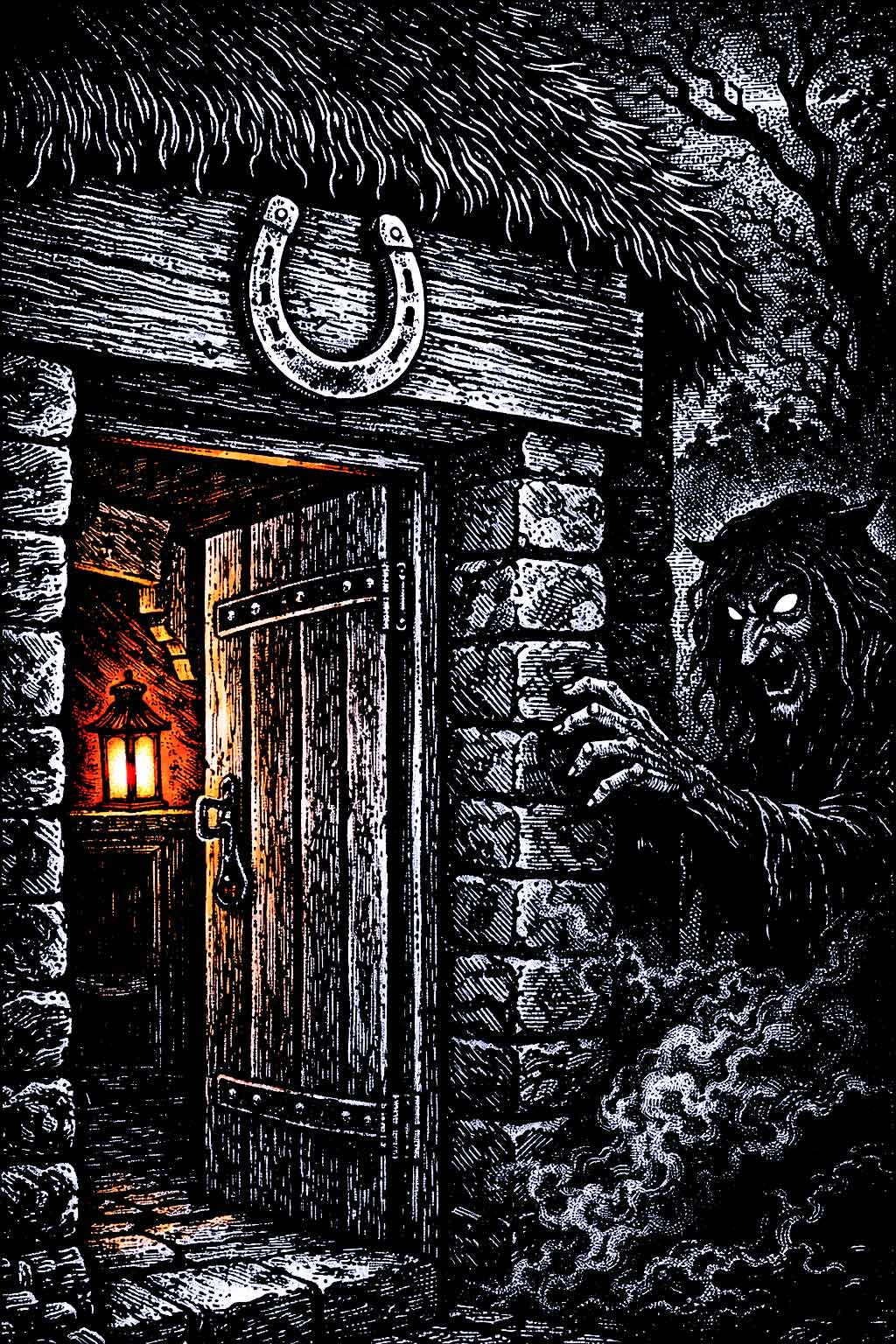 The "canny woman" -- the local wise woman or cunning woman -- played a significant role in Scottish horseshoe ritual. When someone died suddenly on a farm, she would be sent for, and she would declare the body to be "a shift deid by the darts o' the fairies." She would then make a careful search for a likely spot to nail a horseshoe charm, and after a suitable lapse of time, she invariably produced one. J. F. Campbell, in his Popular Tales of the West Highlands (1860-62), records a case at Glenfyne of an old man whose cows suddenly lost their milk. He sought the advice of a wizard, who declared the cause to be a neighbour woman, and told him to nail a horseshoe above the door in secret. From that day onwards, the cows yielded plentifully.
